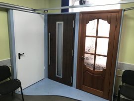 В нашем офисе представлены гаражные секционные ворота с приводом, привод откатных ворот, образцы входных, межкомнатных, внутренних и деревянных дверей: